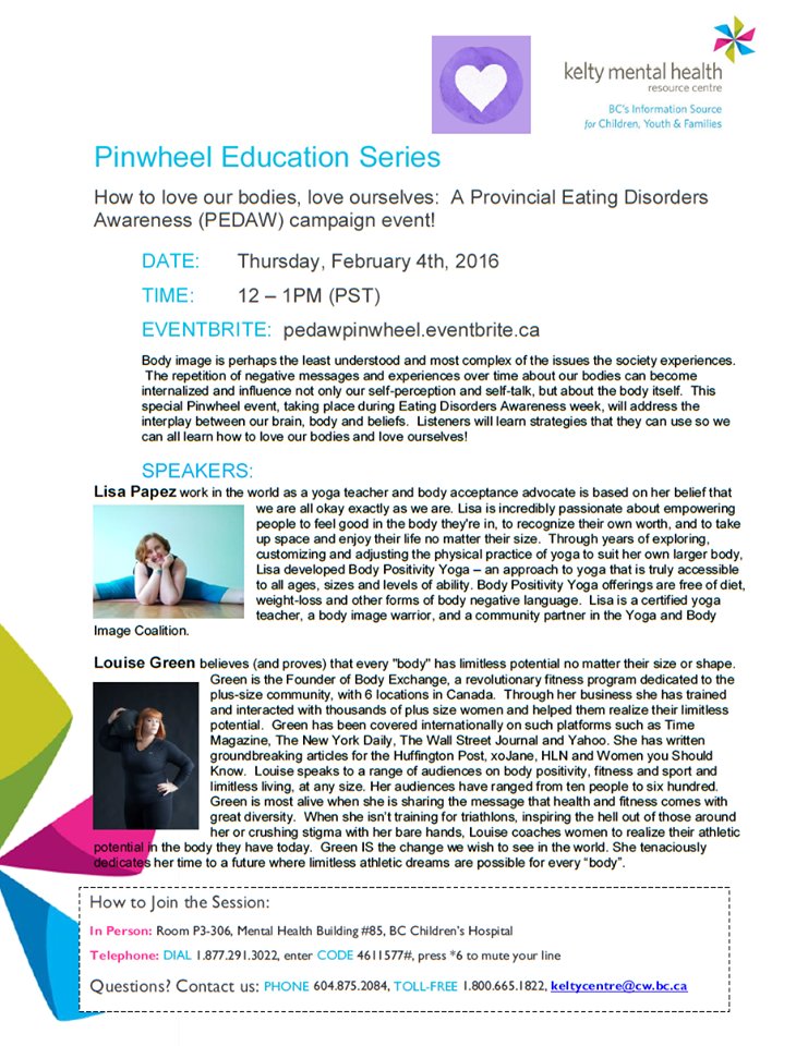 On Thursday, February 4th, 2016, a special Pinwheel event took place during Eating Disorders Awareness Week to address the interplay between our brain, body and beliefs. Body image is perhaps the least understood and most complex of the issues the society experiences. The repetition of negative messages and experiences over time about our bodies can become internalized and influence not only our self-perception and self-talk, but about the body itself. Listeners learned strategies that they could use so we could all learn how to love our bodies and love ourselves!